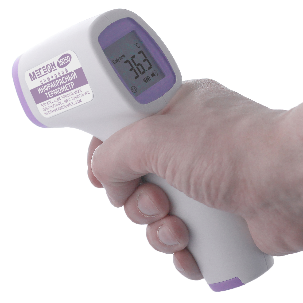 МЕГЕОН 16050 - бесконтактный термометр (градусник), который предназначен для работы в бытовых условиях. Термометр имеет возможность выполнять с высокой точностью измерения температуры поверхности кожи человека в диапазоне от 32°С до 42,9°С и продуктов питания и воды в диапазоне от 0 до 100°С. Прибор имеет функцию звуковой сигнализации превышения температуры с возможностью изменения порога звуковой сигнализации. Термометр также имеет встроенную память на 32 измерения. Также термометр оснащён функцией автоматического отключения, что в свою очередь значительно экономит заряд батарей. Прибор имеет встроенный датчик температуры корпуса, что позволяет значительно повысить точность и стабильность измерений. Функциональные возможности позволяют проводить корректировку поправочного значения смещения. Для работы при плохом освещении предусмотрена подсветка дисплея. Простота настройки и эксплуатации не потребует какой-либо технической подготовки.Таким образом бесконтактный инфракрасный термометр (пирометр) МЕГЕОН 16050 станет незаменимым помощником в быту и значительно упрости измерение температуры детей.