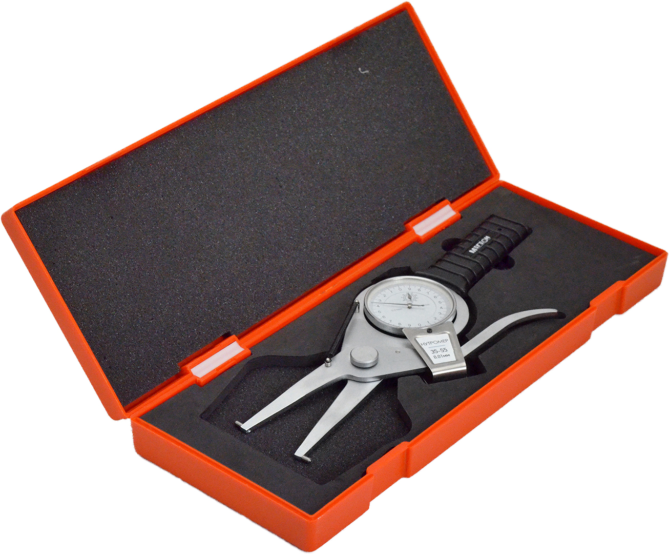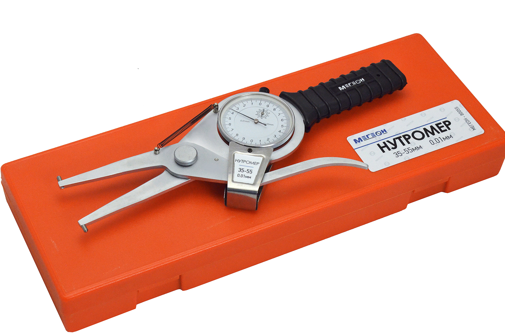 Нутромер микрометрический МЕГЕОН 80055 предназначен для измерения с высокой точностью внутренних размеров изделий относительным методом. В основе считывающего устройства применён индикатор часового типа с ценой деления 0,01 мм. Прибор имеет новую конструкцию ножничного типа, отличную от классических нутромеров. Здесь отсутствуют барабан, трехётка и стебель. К одному из важных преимуществ можно отнести быструю настройку изделия. Применение возможно в диапазоне диаметра отверстия 35...55 миллиметров. Обрезиненная ручка исключит проскальзывания прибора в руках, а наличие антикоррозийного покрытия на элементах конструкции предотвратит повреждение прибора ржавчиной при попадании нежелательной влаги и увеличивает срок эксплуатации. Для настройки ноля требуется установочная скоба 35 мм (приобретается отдельно).